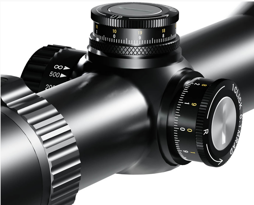 Das Leuchtabsehen 4N befindet sich in der Okularbildebene (2. Bildebene) und bleibt damit beim Vergrößerungswechsel immer gleich groß. Für die Verstellung des Absehens bedarf es keinerlei Hilfsmittel. Das Zielfernrohr verfügt über eine taktische 0,1 MRAD-Verstellung, d. h. pro Klick verstellt sich das Absehen um 0,1 MRAD, also um 1 cm auf 100 m. Das bedeutet für den Anwender in Europa eine einfache Anwendung im dezimalen System. Die Klickverstellung arbeitet dabei absolut wiederholgenau und lässt sich nach dem Einschießen auf Null zurückstellen (für den Fall, dass mehrere Laborierungen genutzt werden).